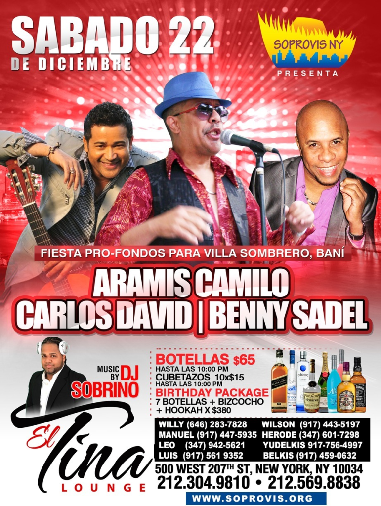 Soprovis New York Les place invitarlos a compartir este Sábado 22 de Diciembre a su Fiesta Navideña en recaudación de fondos para Villa sombrero con los Clásicos de los 80’s. Aramis Camilo, Carlos David y Benny Sadel con sus orquestas cantando todos sus éxitos en un ambiente Navideño en el fin de semana de Navidad.